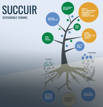 Made from waste using simplified chemical manufacturing SUCCUIR is a unique 100 % biogenic heavy-metal free tanning technology.